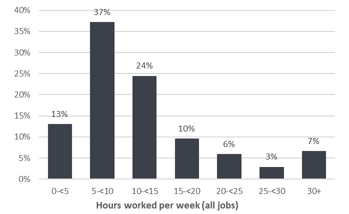Figure 1: Distribution of hours worked by under-18s, all jobs. Source: HILDA, waves 19 to 22.